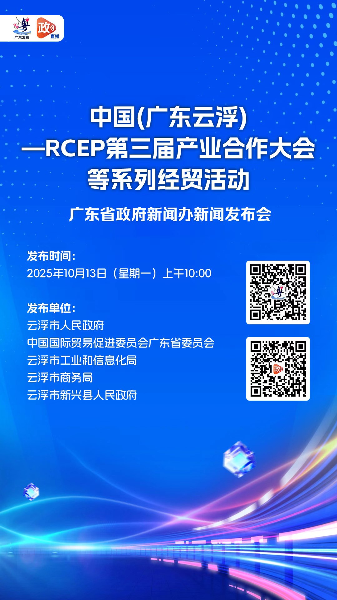 广东省人民政府新闻办公室定于10月13日上午10:00在广东大厦三楼国际会议厅举行中国(广东云浮)—RCEP第三届产业合作大会等系列经贸活动新闻发布会,邀请云浮市人民政府副市长梁东海、省贸促会负责同志、云浮市商务局、云浮市工业和信息化局、云浮市新兴县人民政府主要负责同志介绍产业合作大会等相关情况,并回答记者提问。