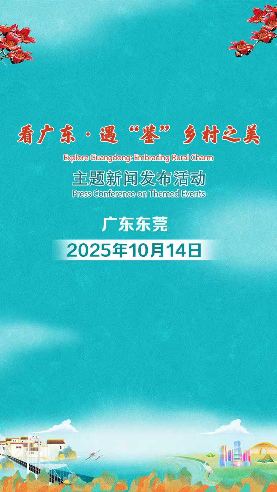 广东省人民政府新闻办公室定于2025年10月14日上午10:30,在东莞市举办“看广东·遇‘鉴’乡村之美”主题新闻发布活动,邀请有关负责人介绍东莞市“百千万工程”阶段性成果,并答记者问。