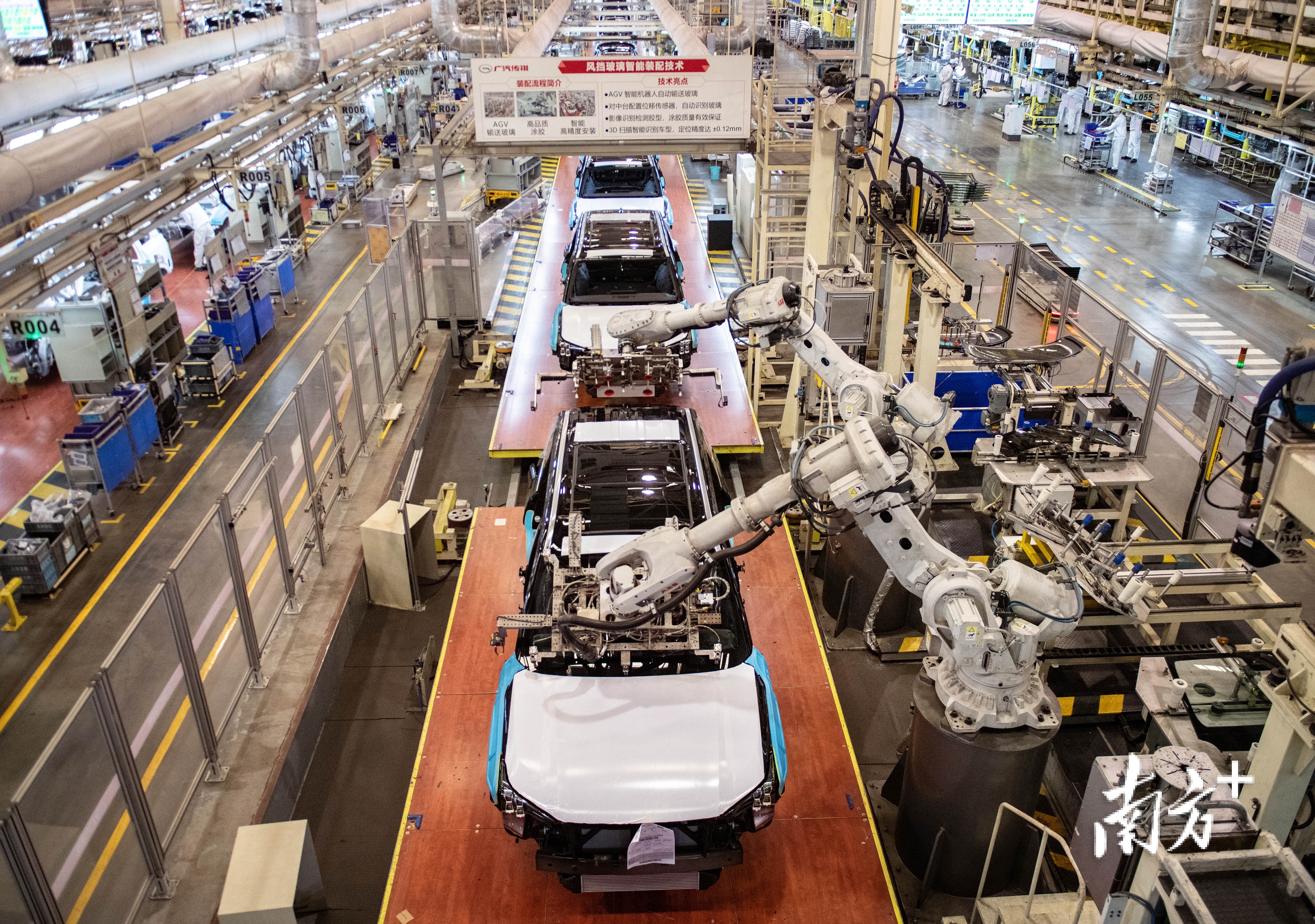 广汽传祺广州工厂第二生产线总装车间,前后风挡玻璃均由机器人全自动安装。