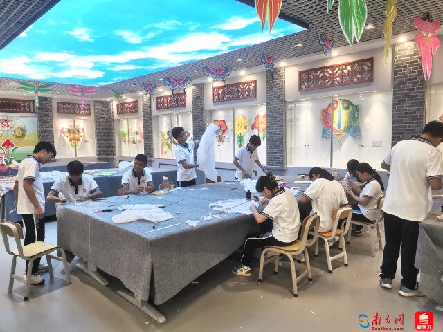 在阳江三中的风筝教室,竹条、绢布、颜料、线轴整齐排列,学生们或专注削制竹骨,或细心糊裱面料,或挥毫绘制纹样,不时互相讨论着风筝的飞行角度与受力原理。该校风筝项目指导负责人表示,风筝的“扎、糊、绘、放”四艺,正是“五育”融合的鲜活载体。