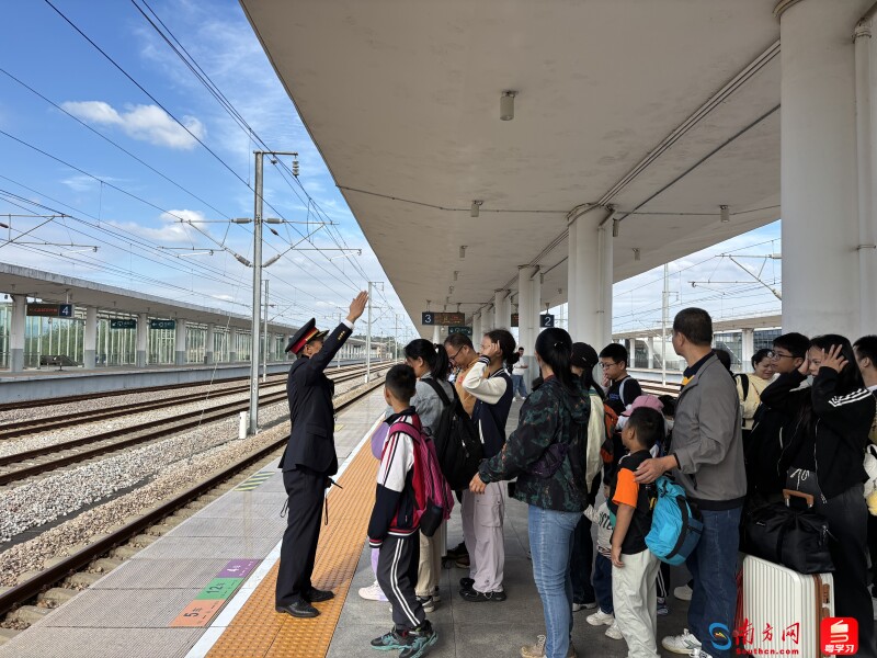 针对秋假期间学生旅客激增的特点,车站同步启动“护学”服务保障。在候车室,现场开设了专用的“护学通道”,工作人员引导携带学生或儿童的家庭提前检票、优先进站。12306服务台也设置了专项服务窗口,为学生群体提供购票咨询、业务办理等便利,并协助家长为符合政策的免费乘车儿童完成线上申报。此外,站台安全成为关注重点,工作人员在列车通过密集时段加强引导,协助家庭旅客在对应车厢位置安全候车,并主动帮扶上下车,全程守护学生出行安全。
